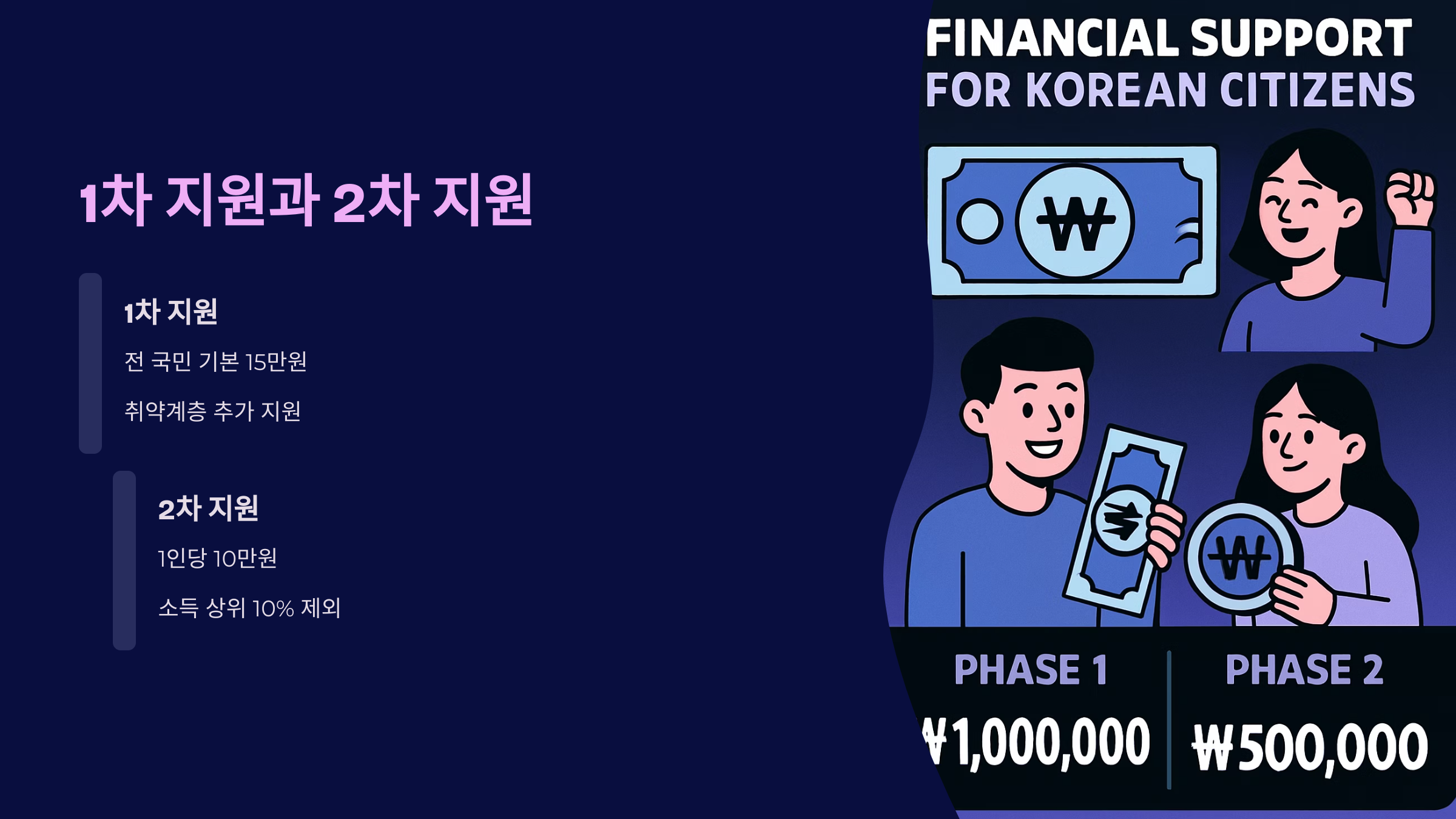 - 1차 지급: 전 국민에게 기본 15만 원이 지급됩니다.
