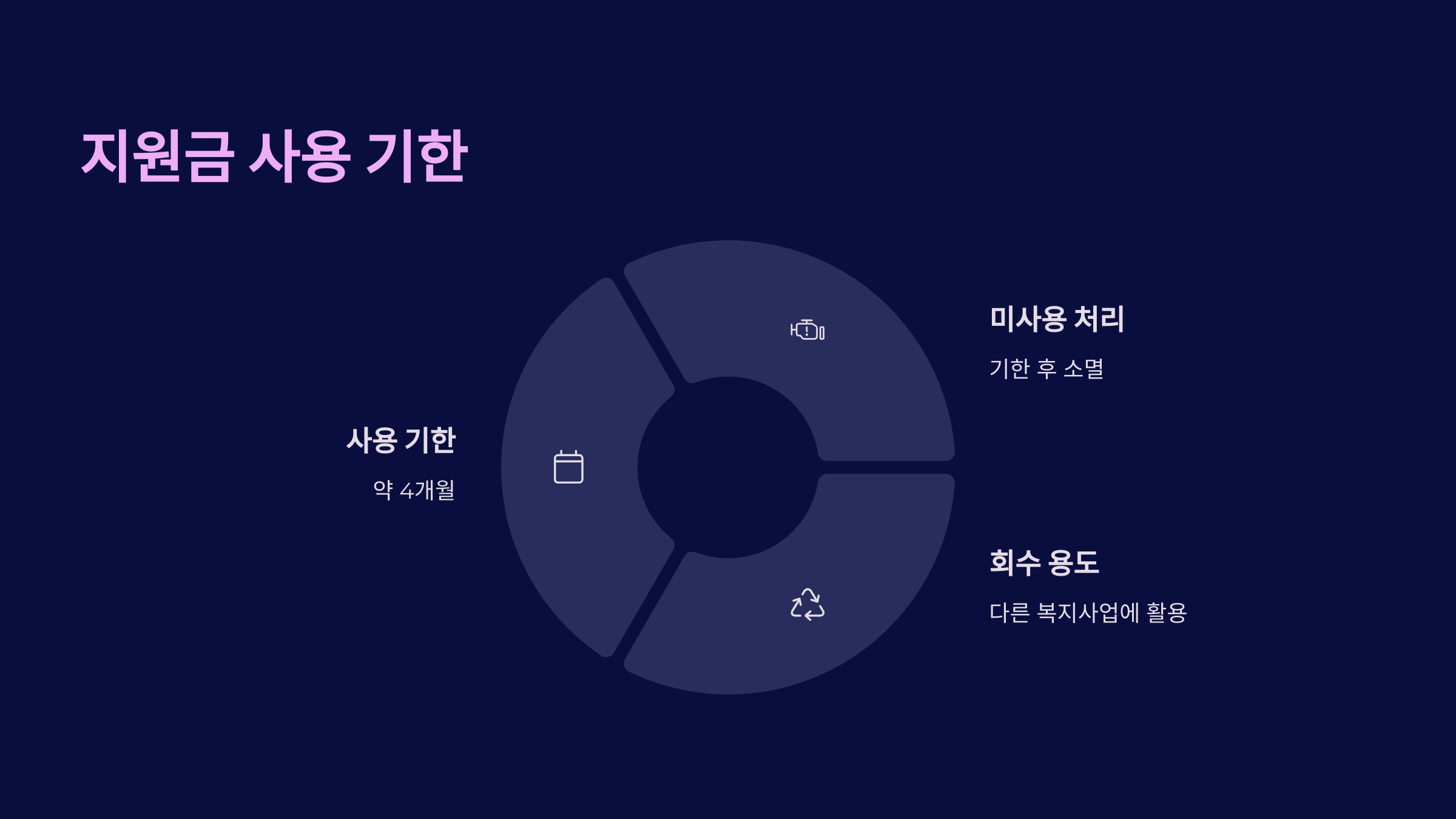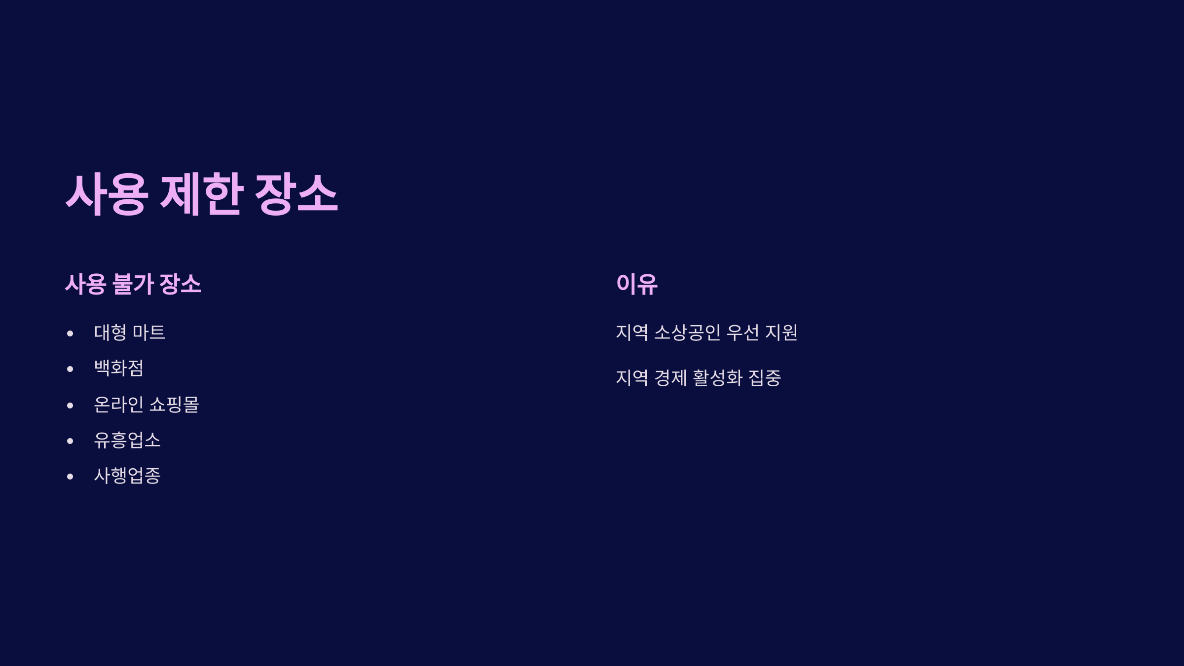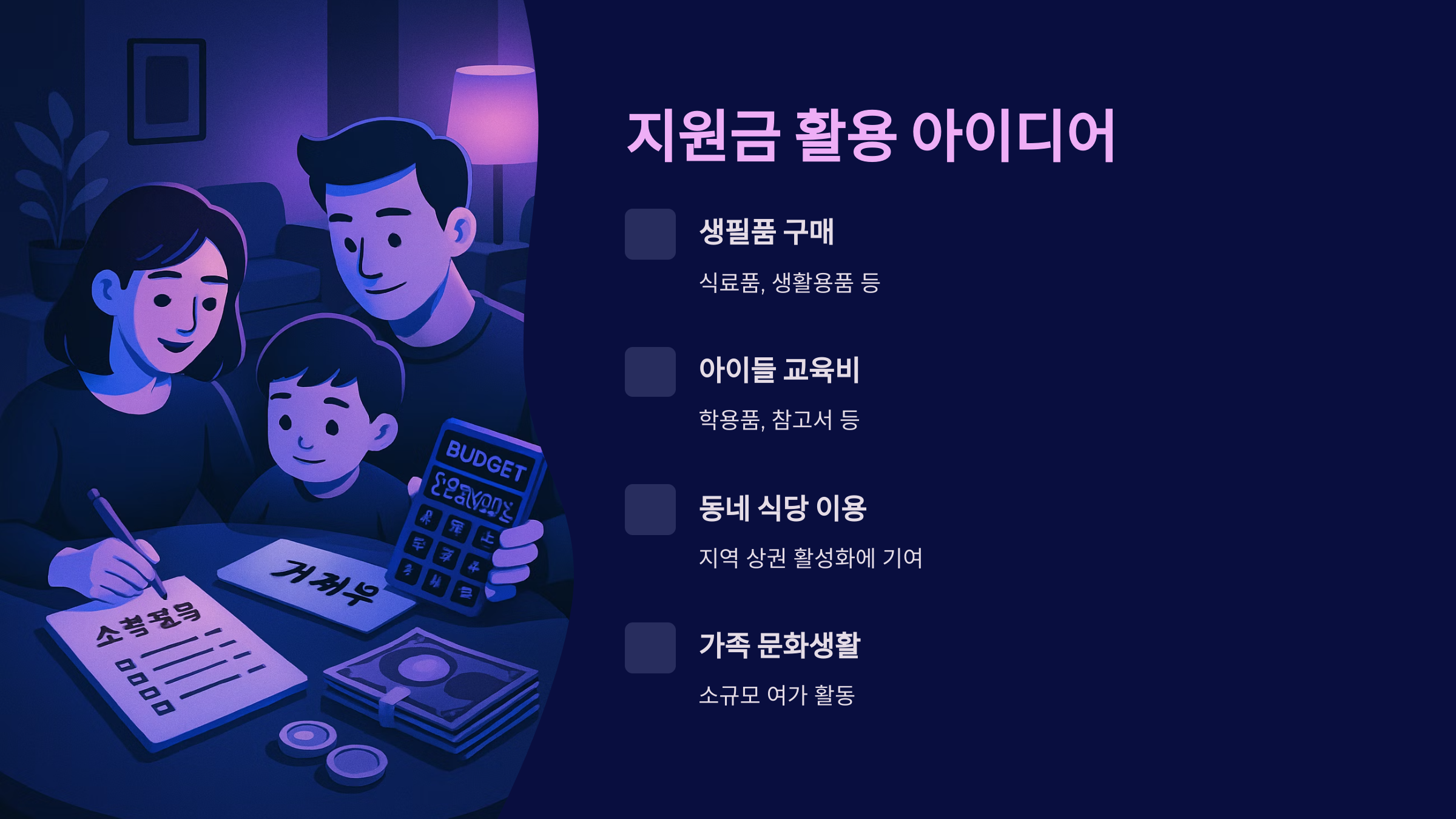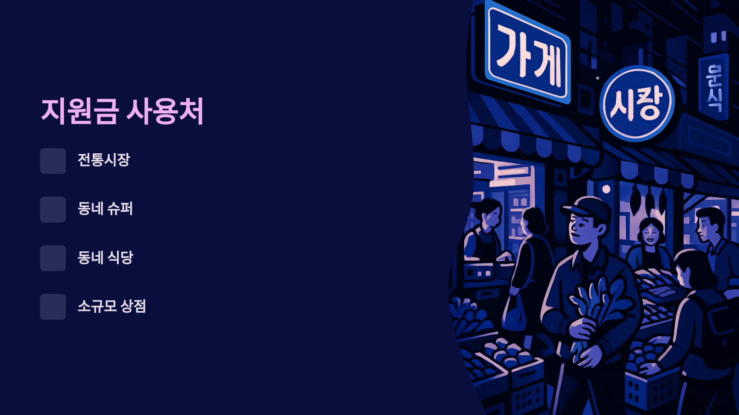 사용처도 아마 동네 전통시장, 작은 가게, 식당 등 지역 내 소상공인 위주로 제한될 것 같아요. 대형마트나 온라인 쇼핑몰에서는 사용이 어려울 수 있답니다. 받은 지원금은 보통 3~6개월 안에 사용해야 하니, 기간 내에 알뜰하게 사용해야겠죠?