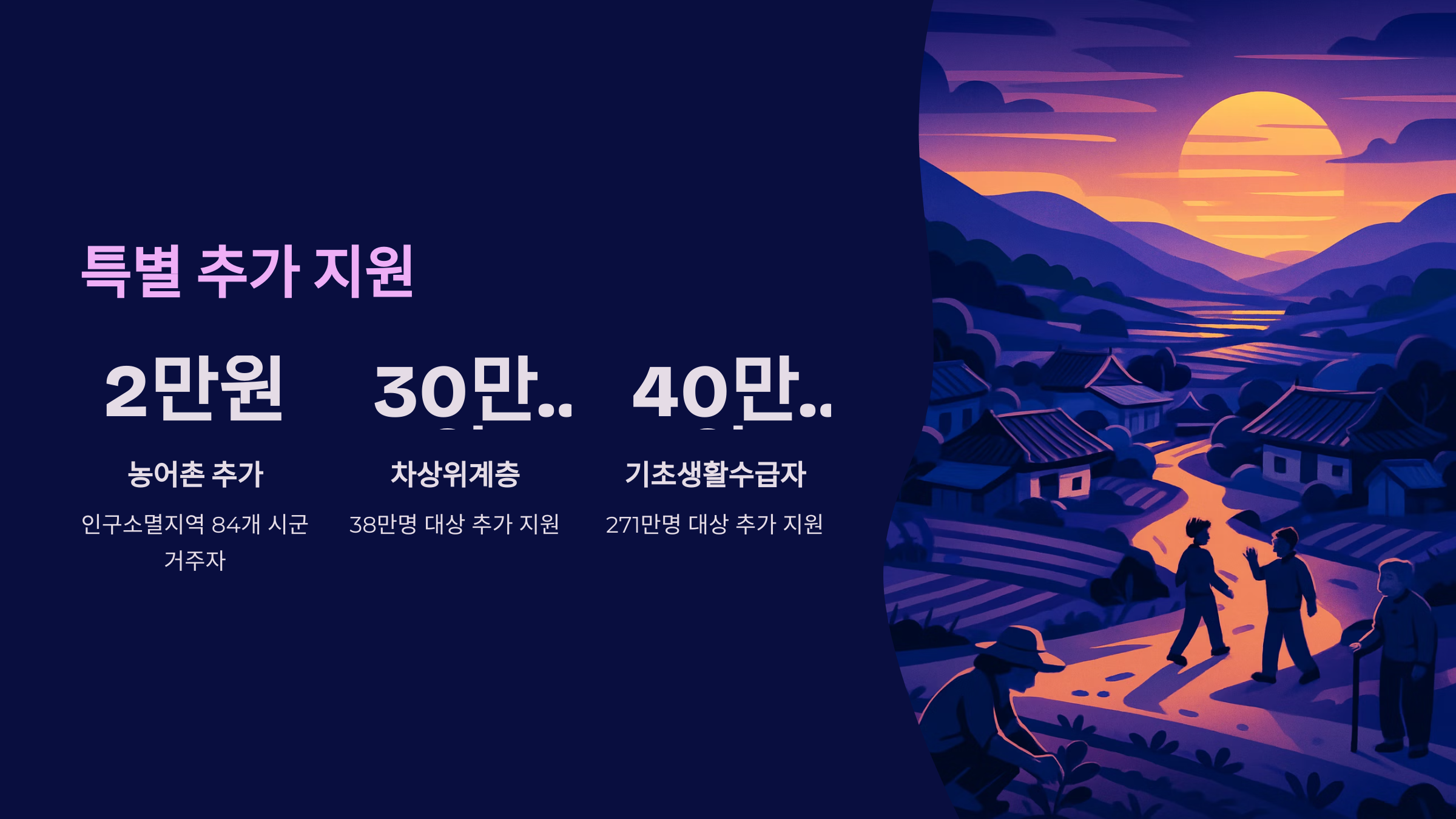 - 농어촌 인구소멸지역 84개 시군(411만 명) 거주자는 1인당 2만 원을 추가로 지원받습니다.