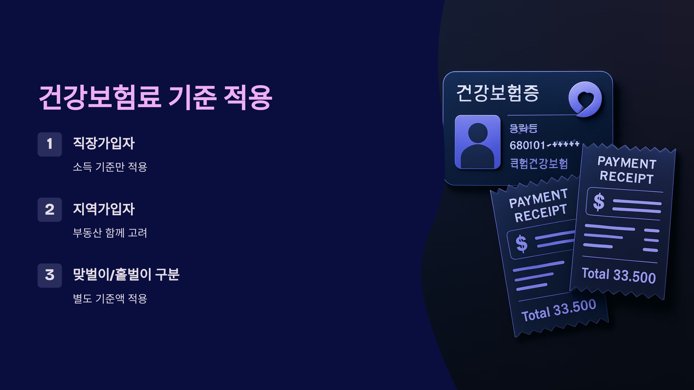 다만, 건강보험료는 맞벌이·홑벌이 여부, 직장 가입자, 지역 가입자 등 유형별로 차이가 크기 때문에 별도의 기준액을 정해야 합니다. 예를 들어, 지역 가입자는 부동산을 함께 고려하지만, 직장 가입자는 소득만을 기준으로 산정합니다. 과거 코로나19 재난지원금 지급 시에는 직장가입자에 한해 부동산은 공시지가 15억 원 이하, 금융소득은 연 2,000만 원 이하라는 별도 기준이 적용되기도 했습니다.