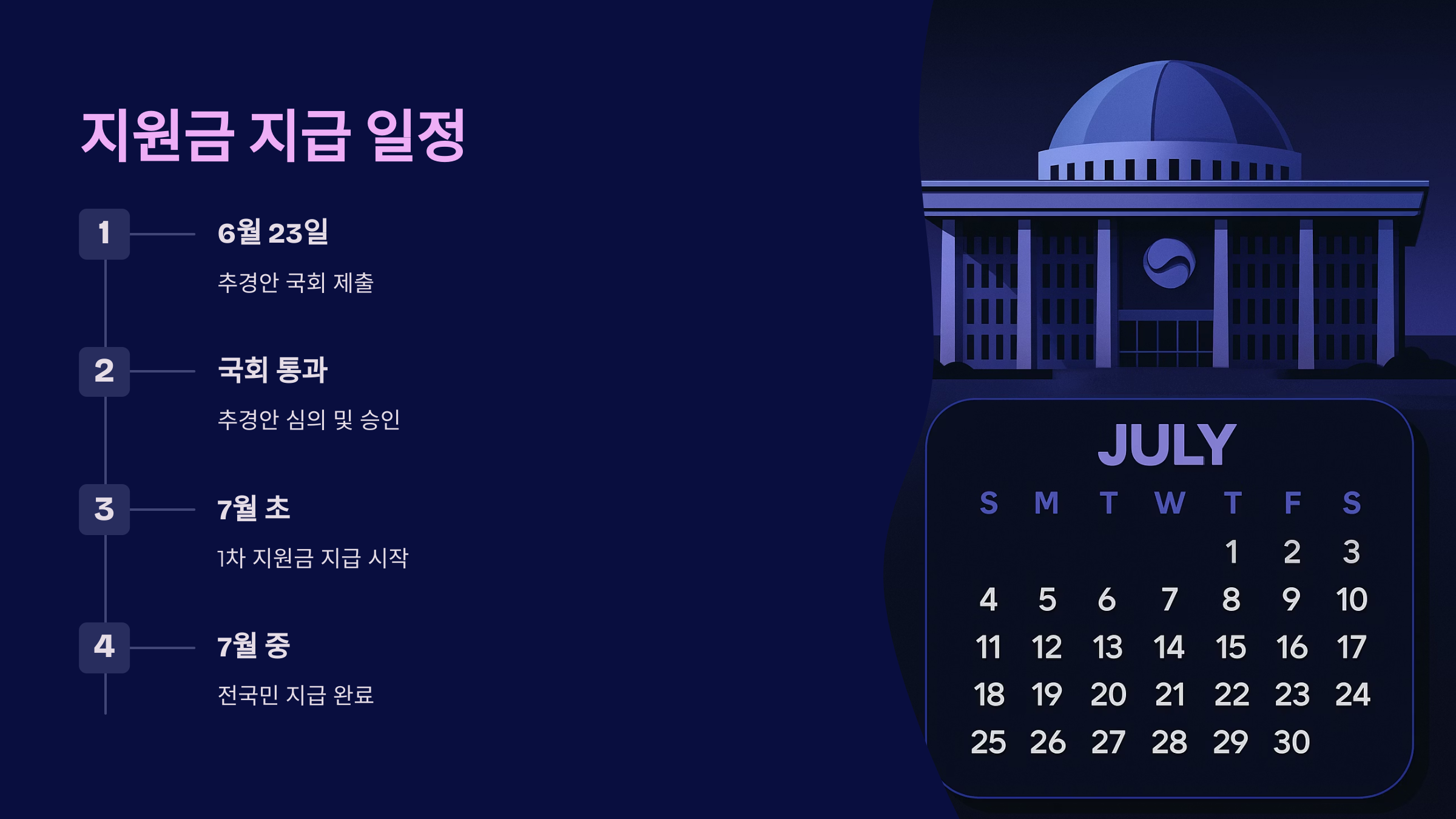 이 지원금은 정부의 추가경정예산(추경)안이 국회를 통과해야 지급될 수 있어요. 6월 23일 지급 예정이라는 이야기도 들려와요. 다음 달(7월)에 받을 수 있을 거라는 기사도 있답니다.