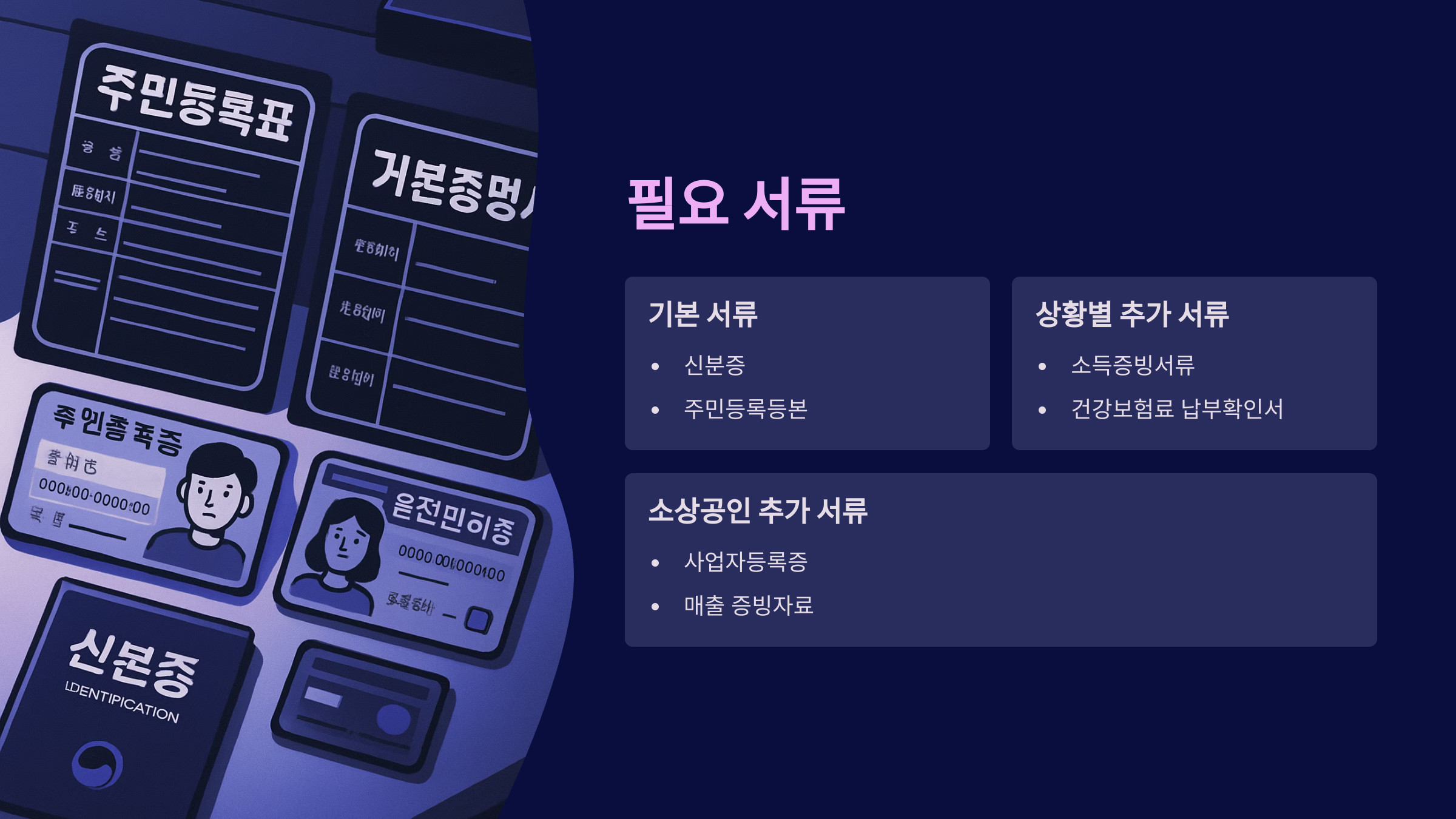 - 추가: 소득이나 재산 증명 서류, 사업자등록증(소상공인 경우) 같은 서류가 필요할 수도 있대요.