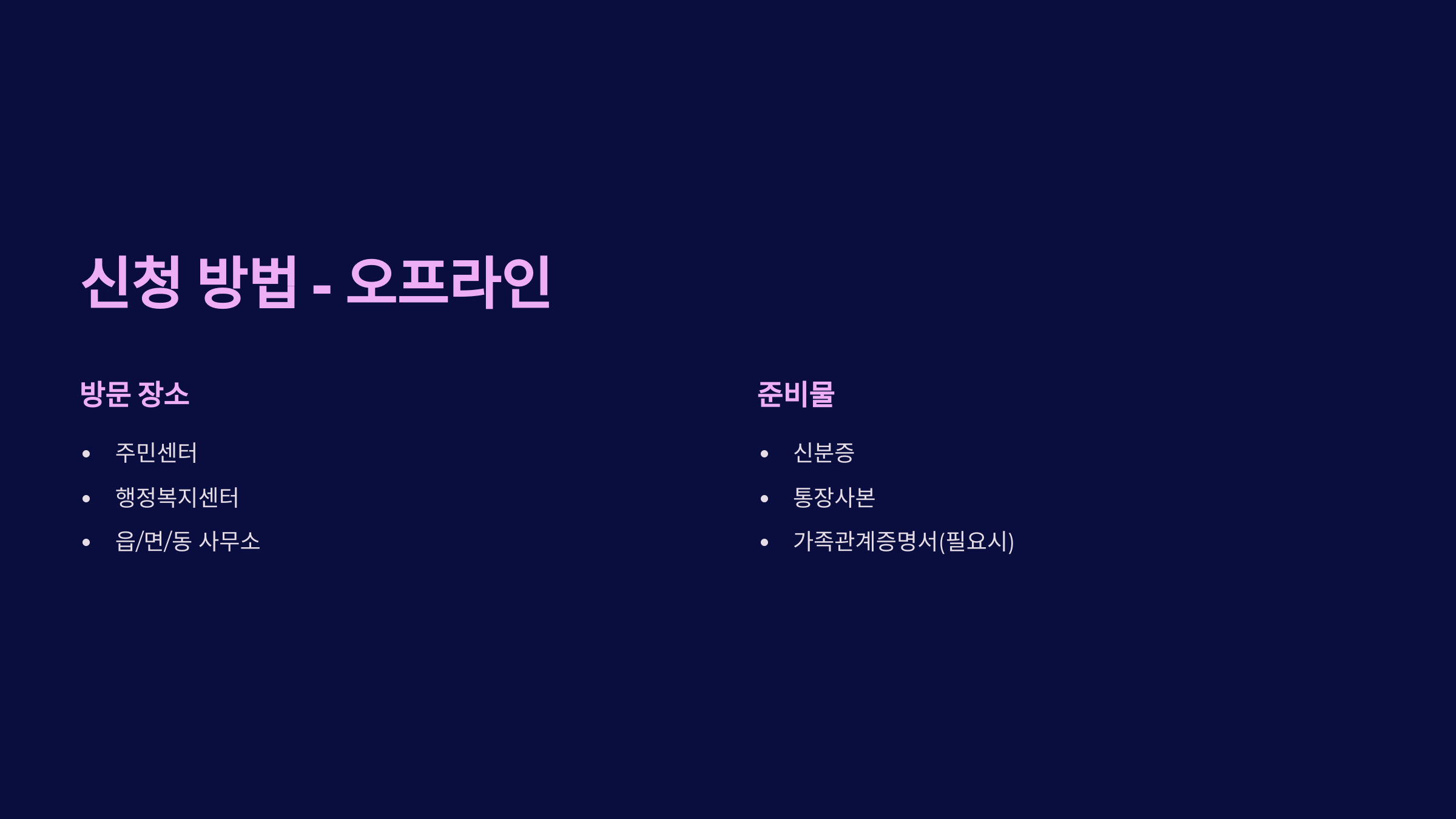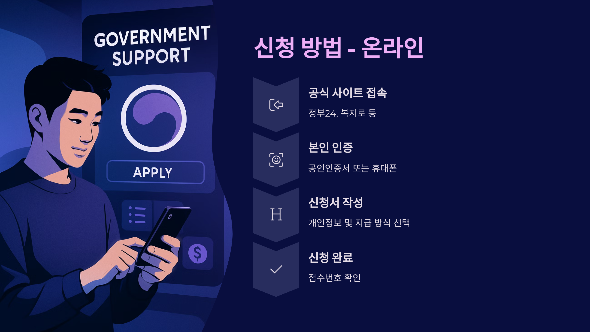 - 오프라인: 온라인 신청이 어려운 분들을 위해 주민센터나 행정복지센터에서도 신청을 받을 것 같아요.