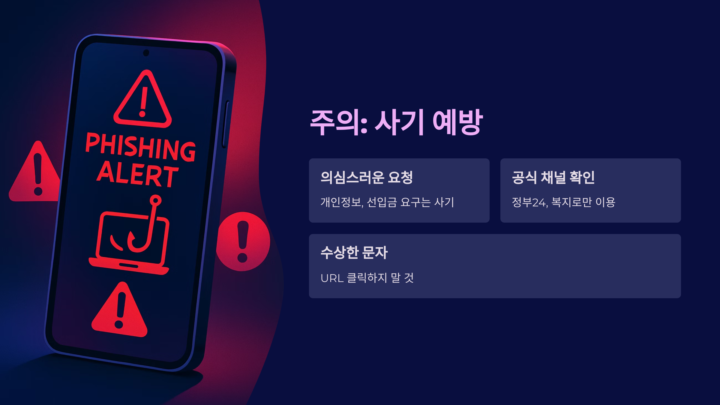 그리고 지원금을 준다고 하면서 개인 정보를 요구하거나 돈을 먼저 보내라고 하는 스미싱이나 사기 문자에 절대 속지 않도록 조심하세요! ⚠️