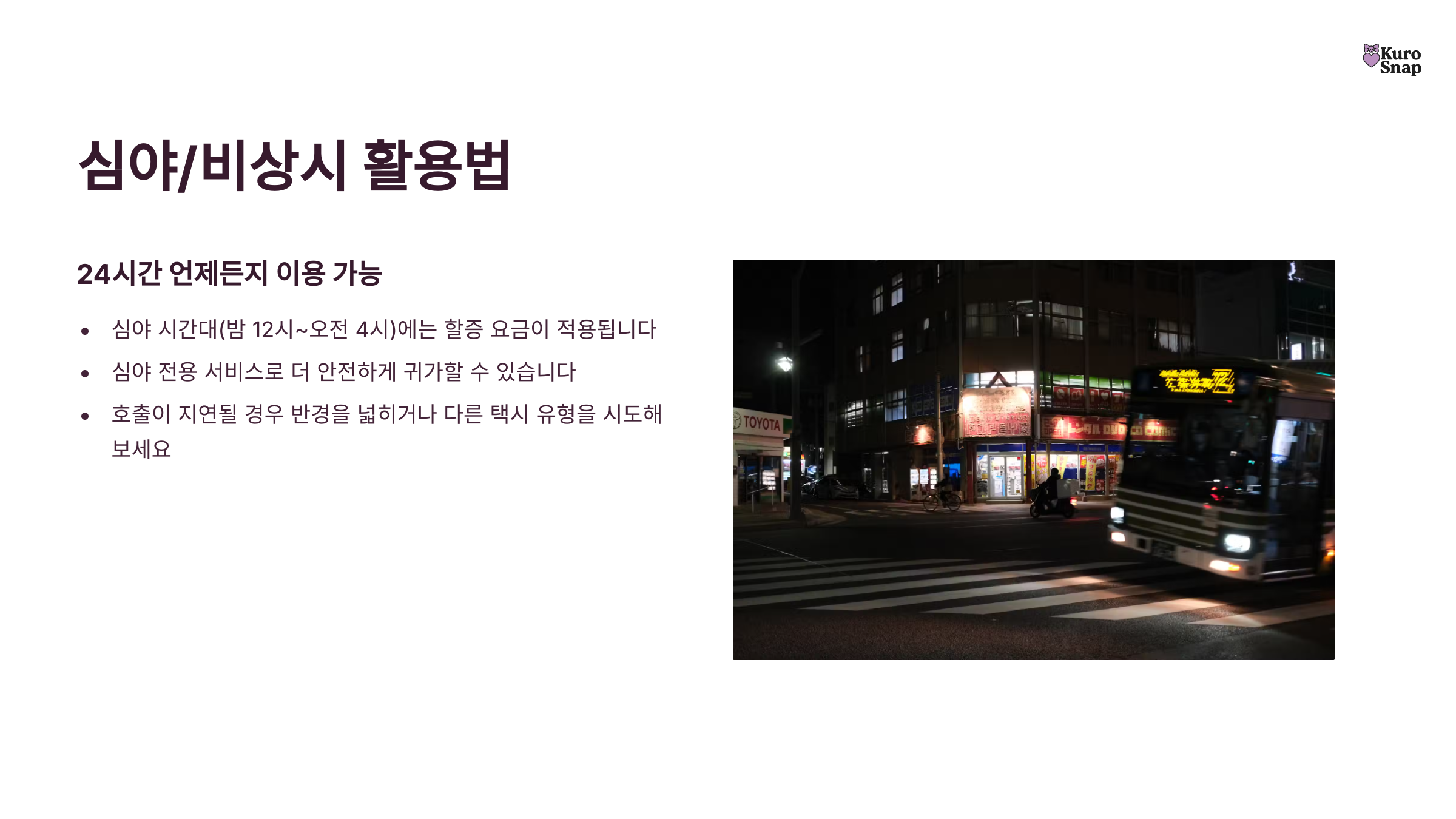 - 호출했는데 택시가 안 잡힘 → 심야시간대엔 ‘스마트호출’ 사용 추천