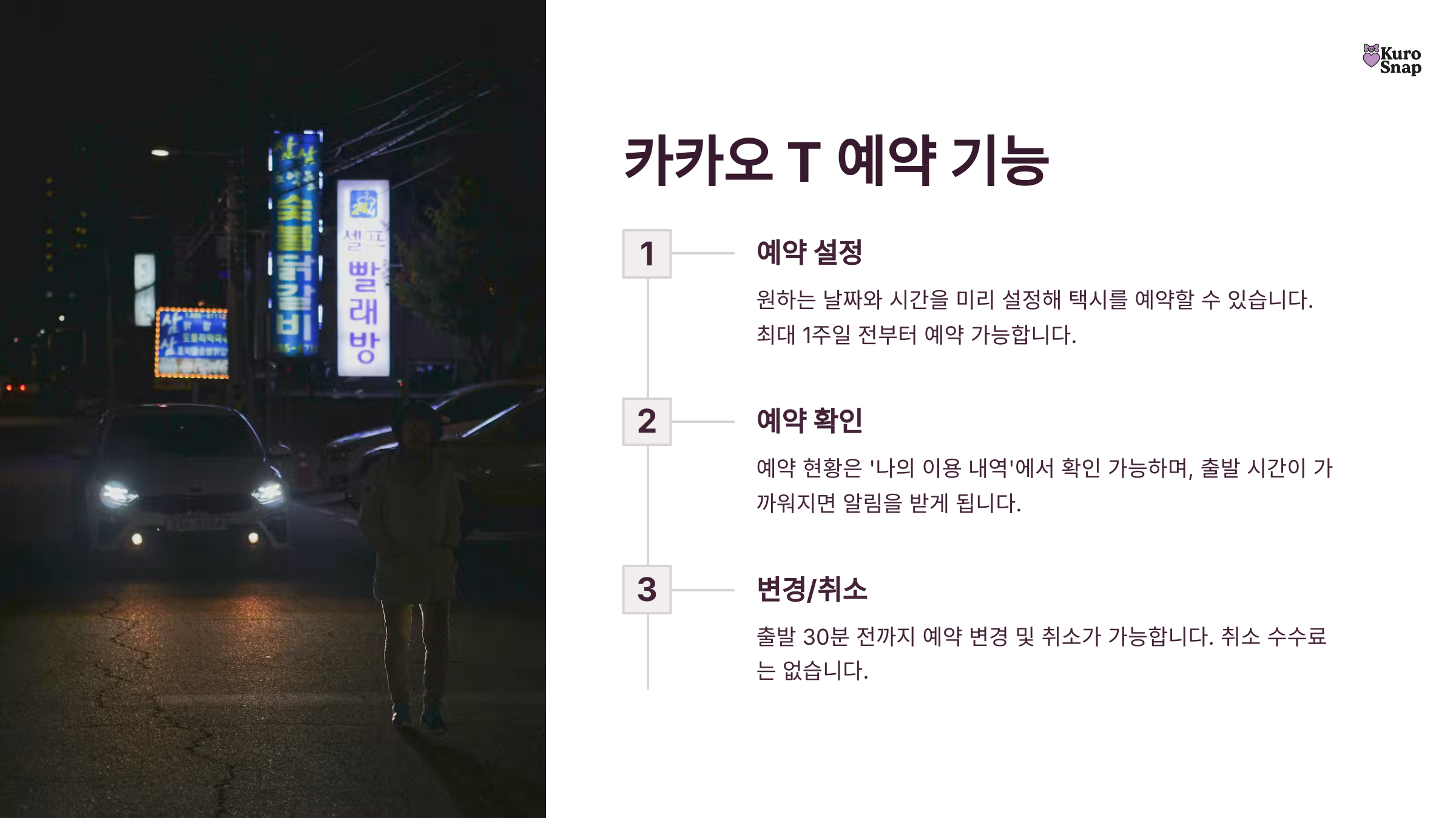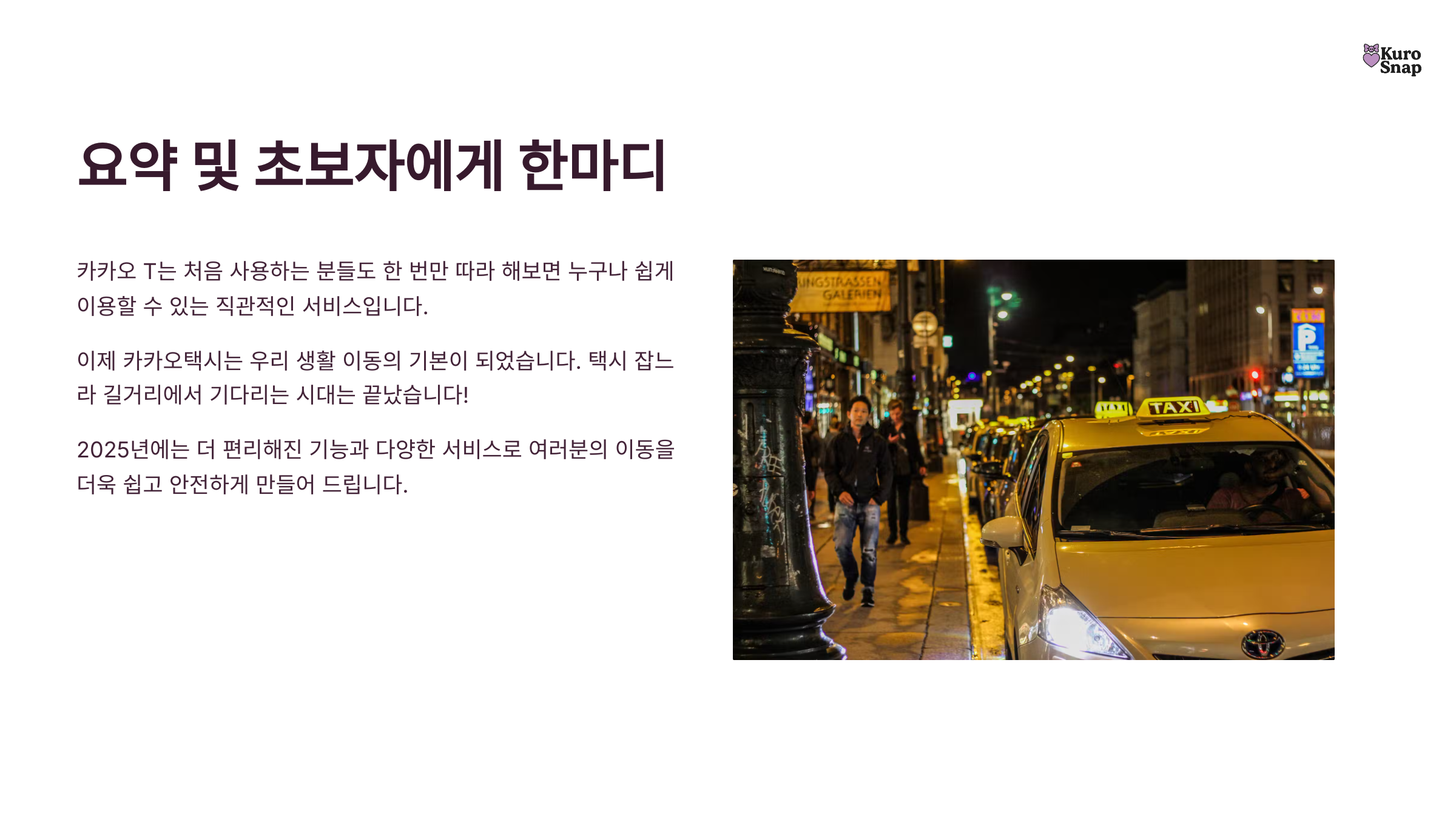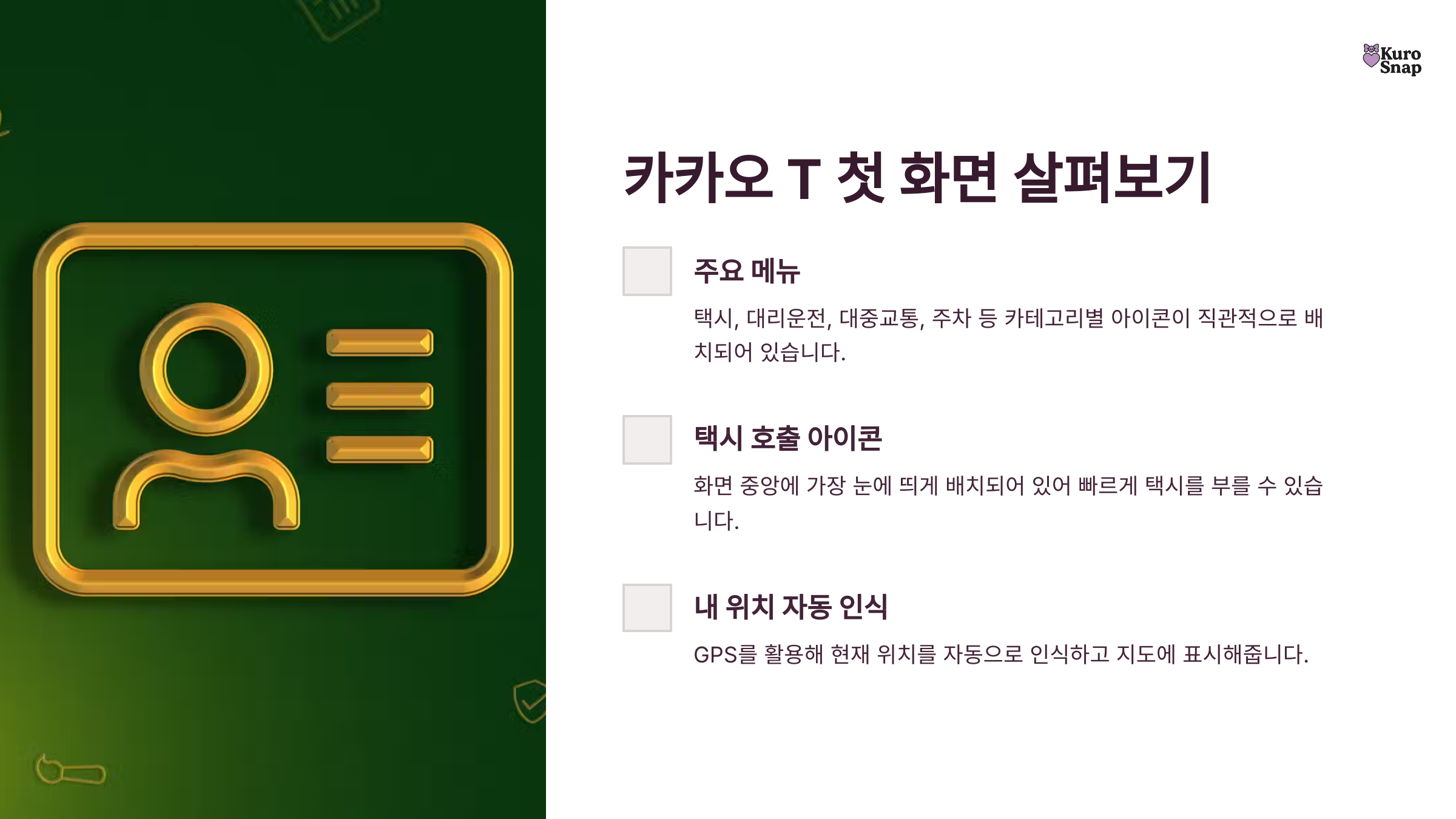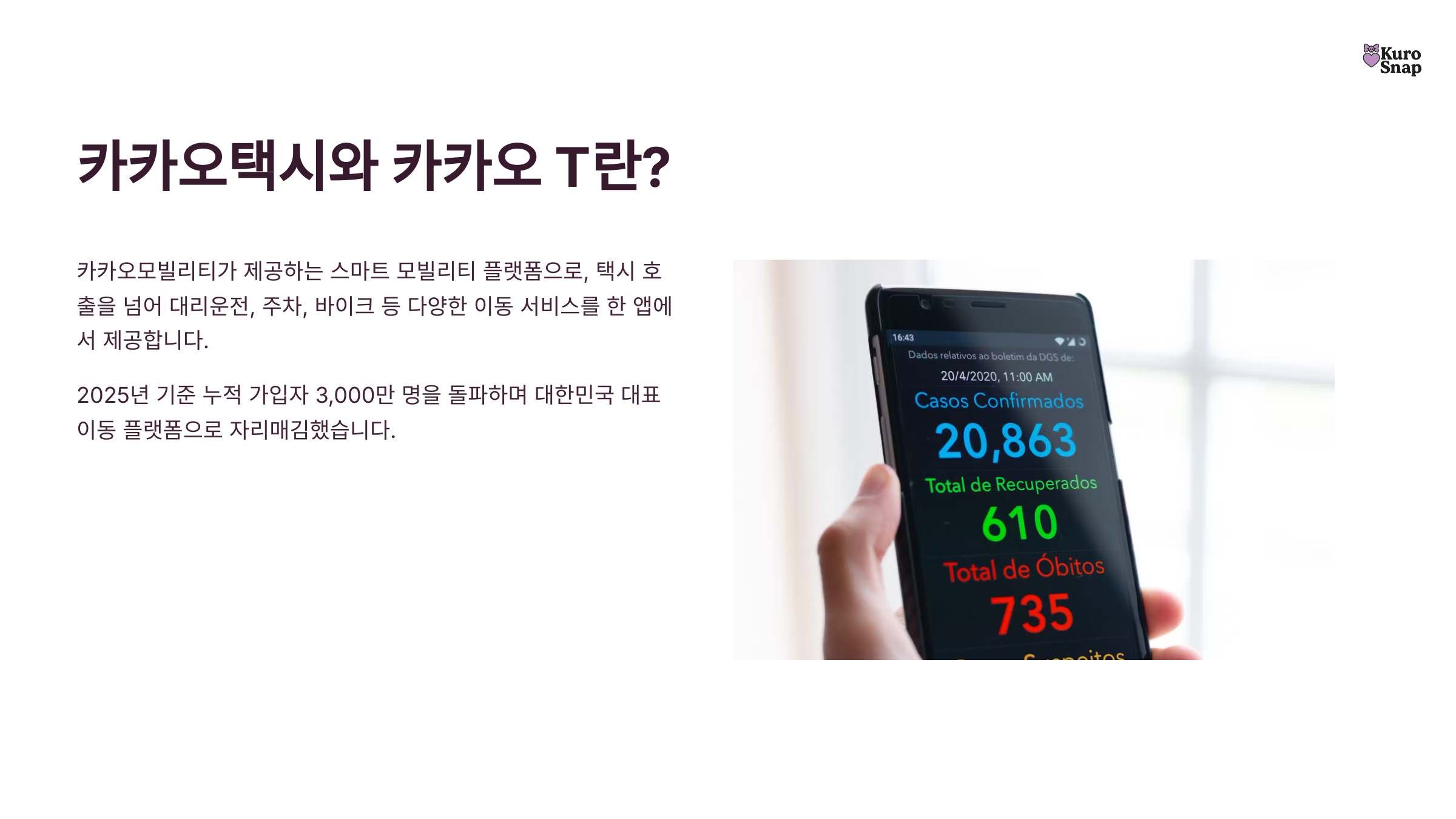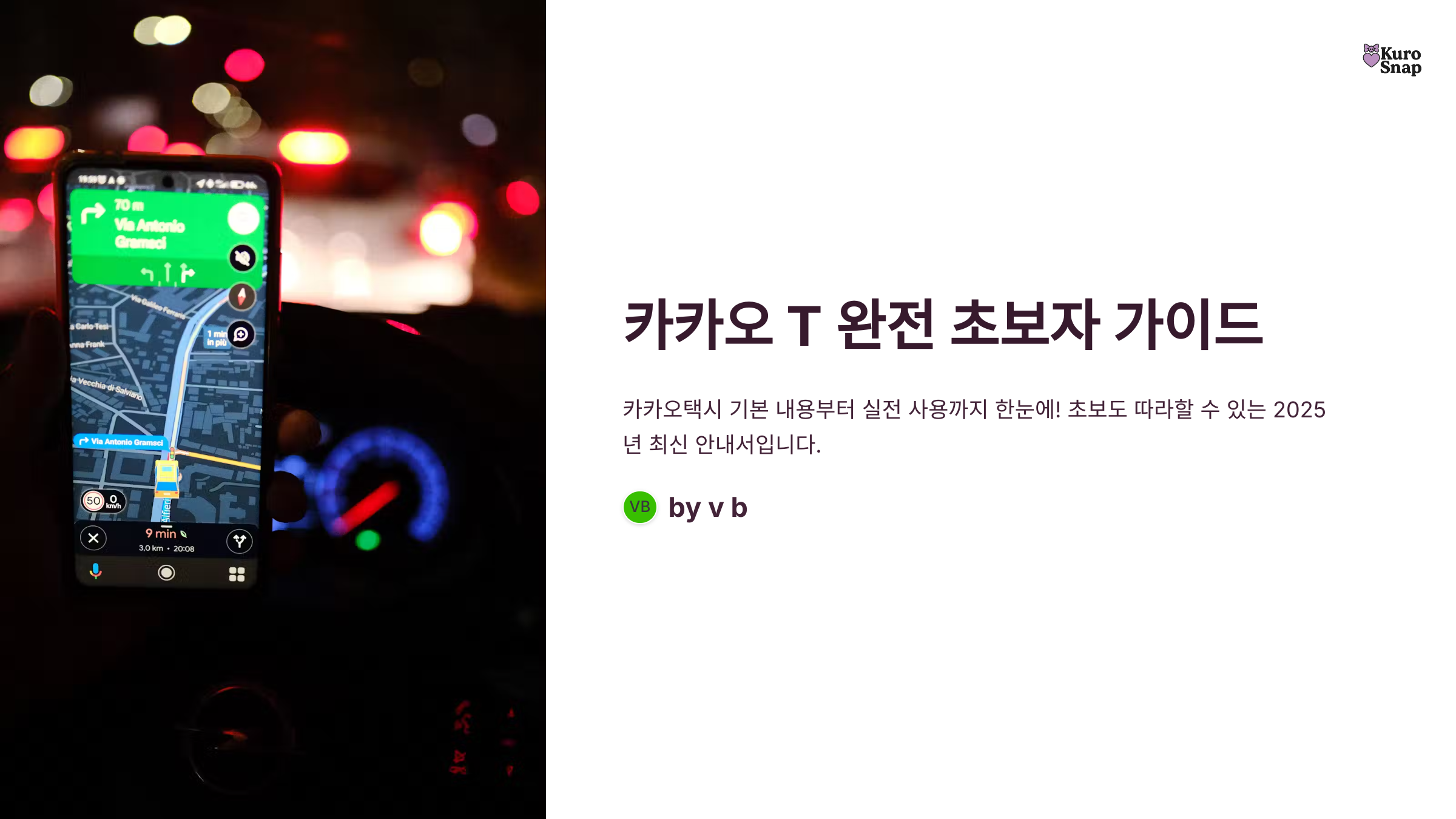 안녕하세요! 저도 한때는 '카카오택시'라는 말만 들어봤지, 실제로 써보진 않았던 사람이었어요. 그래서 처음 카카오 T 앱을 설치하고 실행했을 때, 정말 아무것도 몰라서 한참을 헤맸던 기억이 아직도 생생해요. '목적지는 어디서 입력하지?', '택시 종류는 뭔 차이지?', '결제는 어떻게 하지?' 같은 질문이 머릿속에 계속 맴돌더라고요. 그런 분들을 위해! 이 글에서 카카오택시(카카오 T)를 완전 처음부터 하나씩 알려드릴게요. 카카오택시 앱 사용법, 진짜 왕초보도 이해할 수 있게요 😊