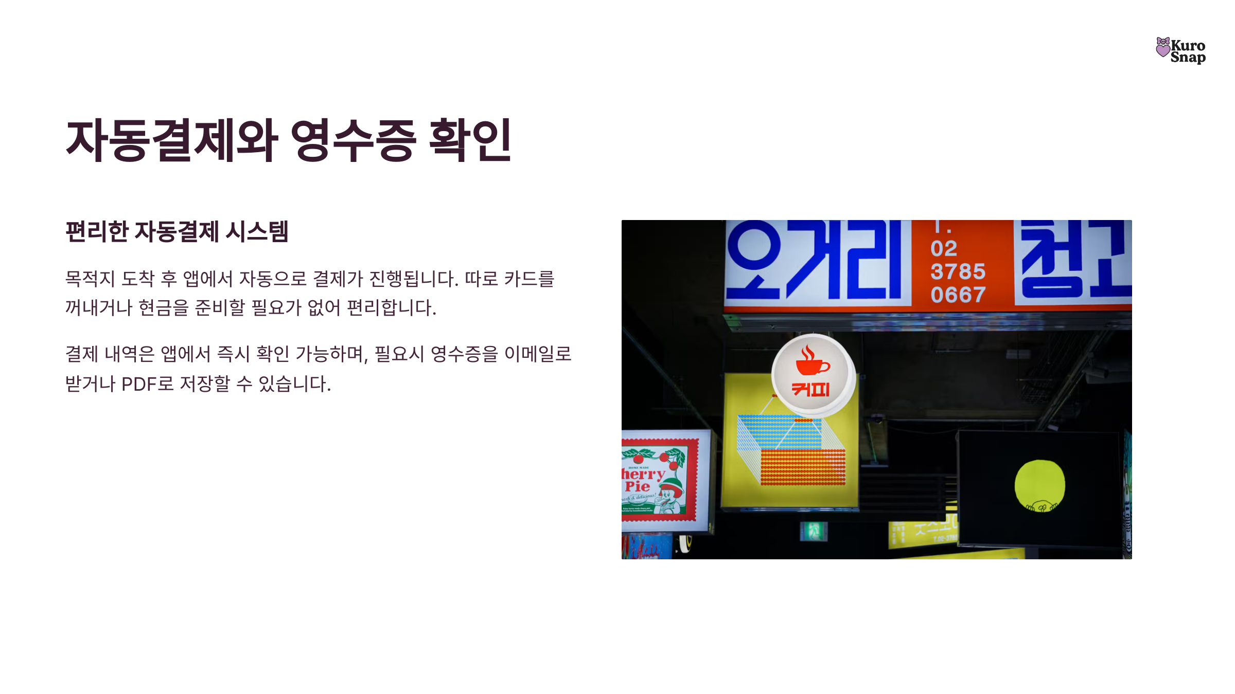 | 카카오페이 | 앱 내 자동 결제, 영수증도 자동 저장 |