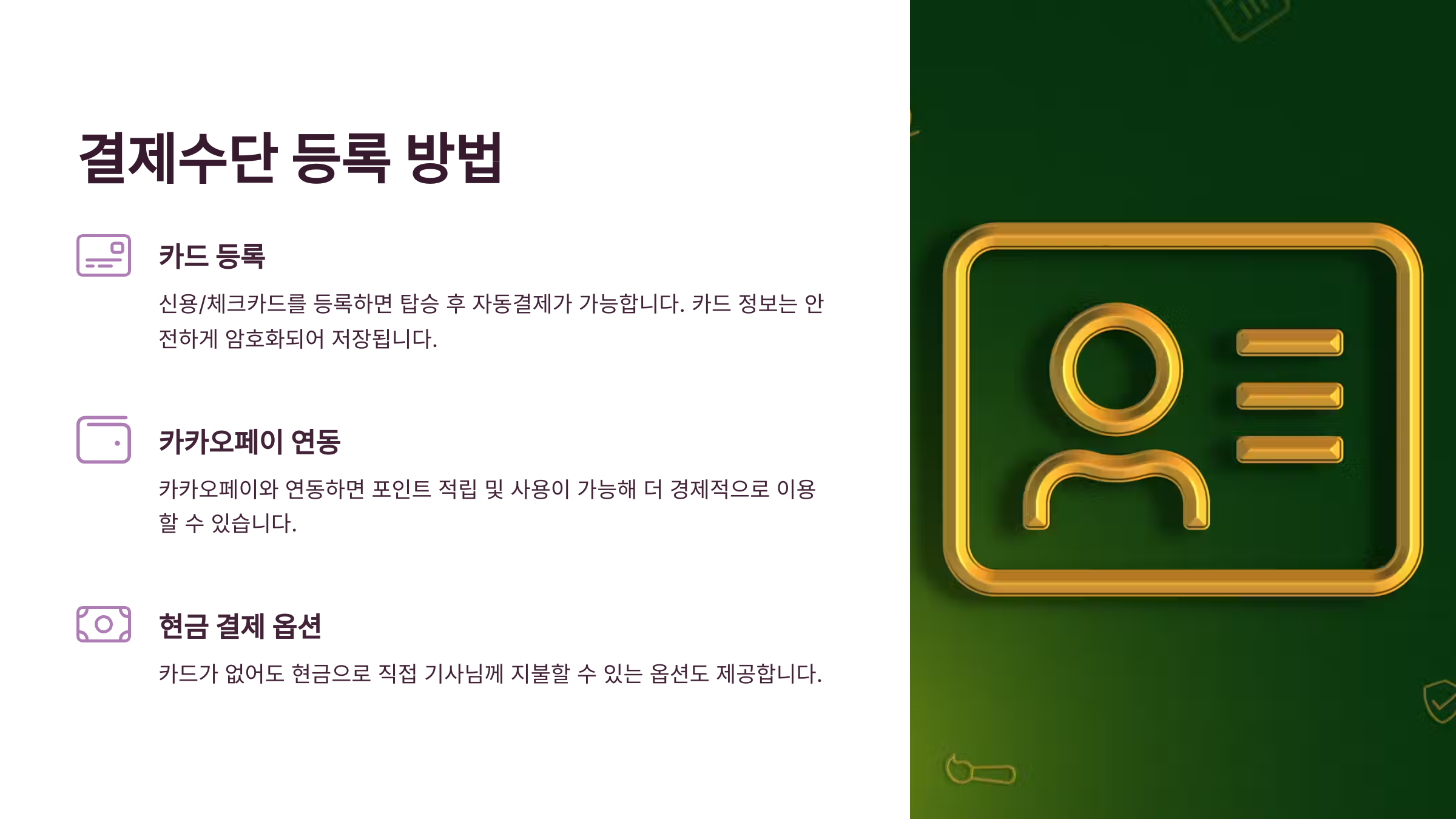 카카오 T는 여러 결제 옵션을 지원해요. 앱 내에서 ‘결제 수단 관리’를 눌러 보면 등록 가능한 카드, 카카오페이, T머니 등이 보입니다. 특히 자주 이용하신다면 카카오페이 자동 결제 등록해두는 걸 추천드려요.
