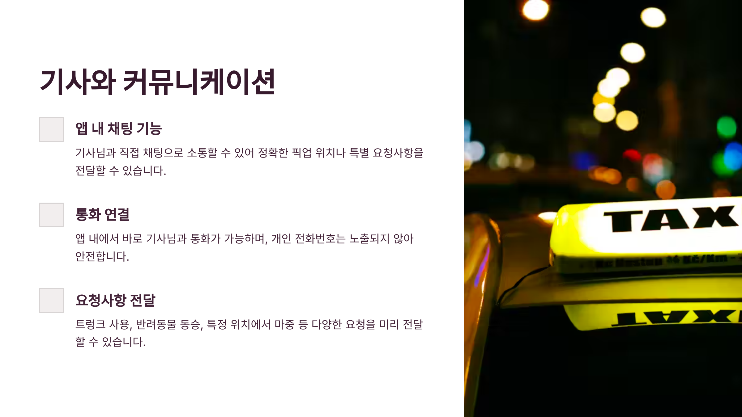 앱 내 ‘연락하기’ 기능으로 메시지를 보내보세요. 전화 연결이 안 될 경우, 기사님이 바쁠 수 있어요.
